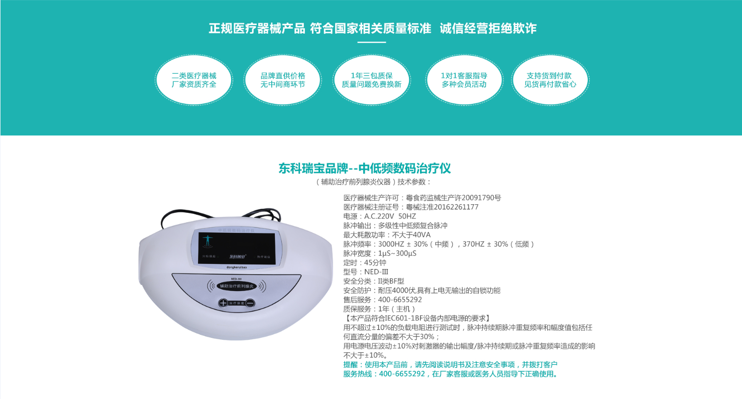 該治療儀器使用220v交流電源,符合國家YY0505標準電磁兼容有關要求,具有耐壓4000伏和上電無輸出自鎖的安防功能,可適用于家庭、中小醫(yī)療機構、鄉(xiāng)鎮(zhèn)醫(yī)院、社區(qū)診所理療科室等,品牌廠家為每位用戶建立服務檔案,專職客服提供一對一跟蹤指導服務,解決用戶使用中的各種疑難問題,咨詢服務電話:400-6655-292,東科瑞寶品牌系列產品全國尋求合作伙伴,批零兼營,東科瑞寶專心誠意為您服務!